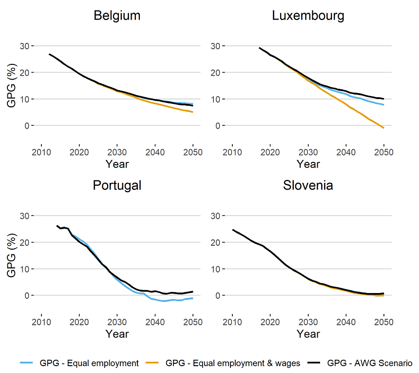 This graph shows the projected development of the GPG under the – admittedly unrealistic – hypothesis that labour market participation rates are equalised across men and women from 2021 on (“Equal employment” scenario). In the “Equal employment and wages” scenario there are, additionally, no gender differences in part time employment and in hourly wages. The combined impact of these scenarios in 2050 is negligible in Slovenia, small in Belgium and somewhat larger in Portugal and Luxembourg. One reason for these dampened effects is that the complete equalisations of employment and wages from 2021 on will have only partially affected the population of retirees in 2050. In Slovenia, moreover, employment rates for most age groups are approximately the same for women and men even in the AWG scenario, and the gender pay gap is only around 8% in 2019. Equalization of wages, in addition to equal employment rates, will lead to a further closing of the Gender Pension Gap in the long run when fully affecting all retirees. In Belgium and Luxembourg part-time working rates are also set equal between women and men in that scenario, and this makes an important contribution to the closing of the Gender Pension Gap.